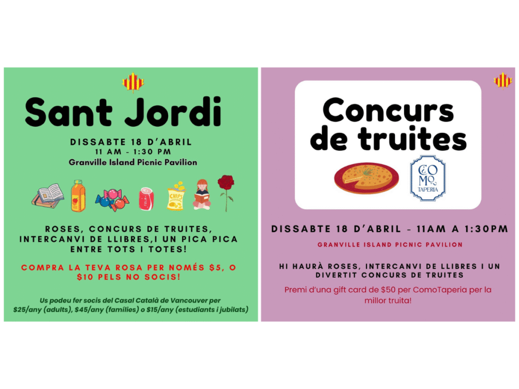 Per celebrar la diada de Sant Jordi, ens ajuntarem el dissabte 18 d’abril, d’11:00 a 13:30, al Picnic Pavilion de Granville Island (el mateix lloc que els darrers dos anys!).